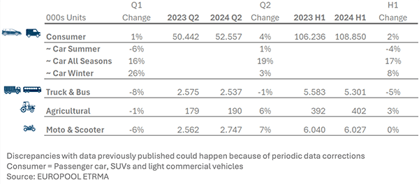 The European Tyre and Rubber Manufacturers’ Association (ETRMA) publishes its members’ replacement tyre sales figures for the second quarter, and the first half of 2024.